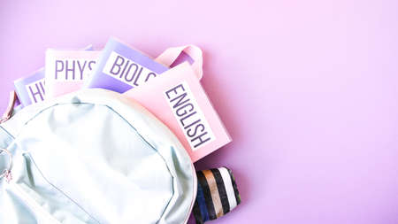 Flat lay composition with backpack and school supplies and subject books on color background. copy space, english biology physics
