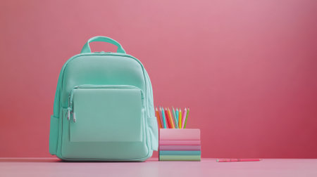 School backpack for colorful school supplies and things. plain background with space for text, horizontal image, generative AI