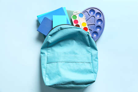 School backpack and stationery on color background