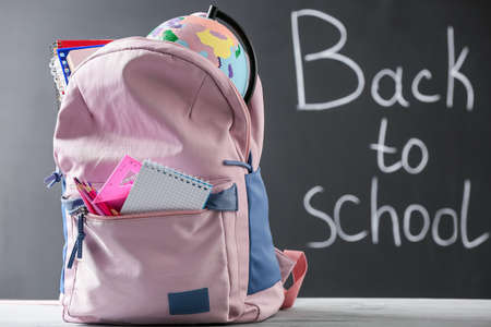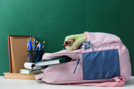 School backpack and stationery on table near blackboard