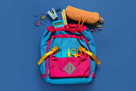 School backpack with stationery on blue background