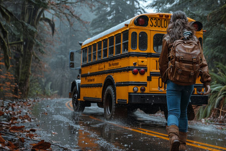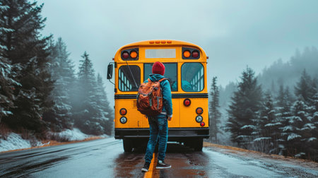 Traveler with Backpack Boarding Yellow School Bus in Misty Forest