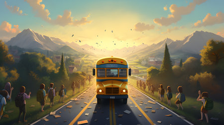 A yellow school bus drives through a rural autumn landscape generated by artificial intelligence