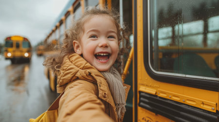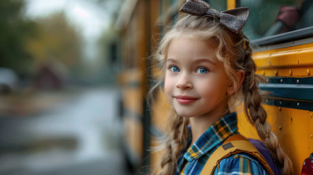 Young girl with backpack heading to school bus, embracing the back to school spirit
