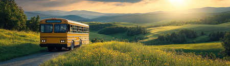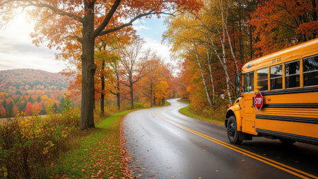 A vibrant yellow school bus travels along a winding road amidst a colorful autumn landscape. The scene features lush trees with orange and yellow foliage, set against rolling hills under a clear sky. The overall composition suggests a sense of journey and tranquility, suitable for various editorial and commercial applications.