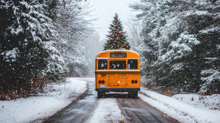 A vibrant yellow school bus adorned with a Christmas tree travels down a snowy forest road, capturing the essence of a winter holiday adventure filled with joy and nostalgia.