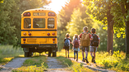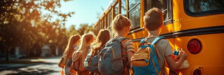 In the warm morning sun, a group of joyful children, backpacks and lunchboxes in hand, excitedly board the bright yellow school bus, captured in energetic, banner
