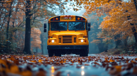 A bright yellow school bus sits on a serene rural road adorned with vibrant golden leaves from trees, creating a beautiful autumn landscape perfect for visual storytelling.