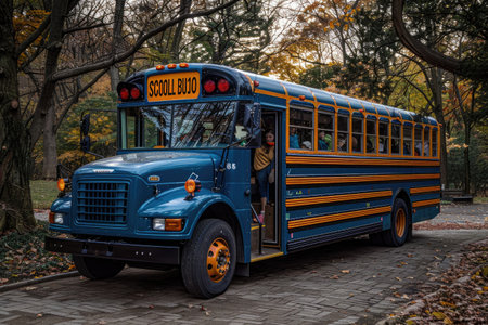 A vintage yellow school bus sits on a quiet road, framed by vibrant autumn leaves, offering a nostalgic touch of adventure and scenic beauty through nature.
