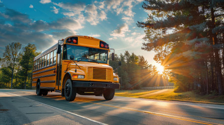 An atmospheric establishing shot of a school bus in the soft morning light. Generative AI