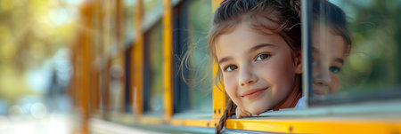 Happy Caucasian girl leaning out the window on a yellow school bus.