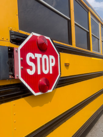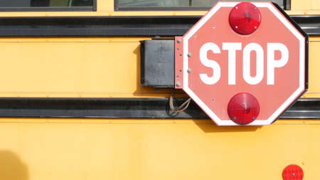 stop, closeup side view stop sign on iconic retro yellow school bus in United States of America. back to school concept background with copy space on yellow bus surface. stop traffic sign