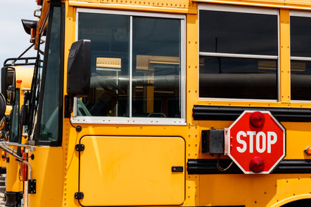 Indianapolis - Circa June 2019: Stop sign on the side of a school bus. It is illegal to pass a bus when this sign is displayed when students are boarding IV