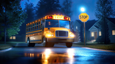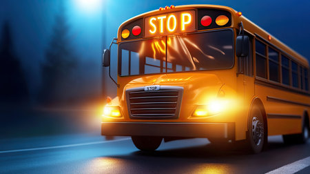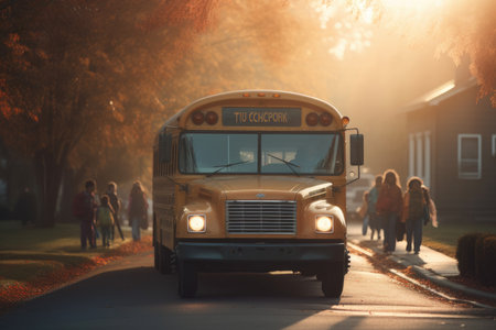 An atmospheric establishing shot of a school bus in the soft morning light. Generative AI