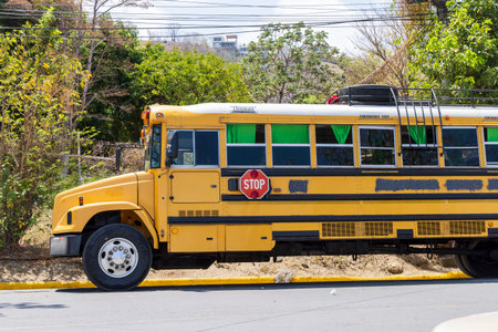 San Juan del Sur, Nicaragua - March 23, 2024: Colorful public transport schoolbus parked along the road in San Juan del Sur in Nicaragua