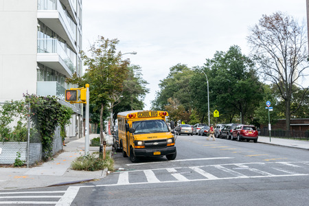 New York, USA - September 21, 2015: School bus rides through the streets of Brooklyn, New York.