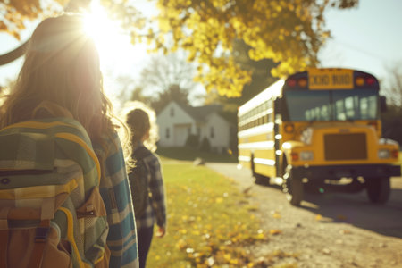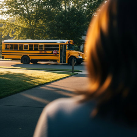 A child with a backpack walks toward a school bus in the bright morning light. The scene captures a story-driven, realistic moment of a typical school day.