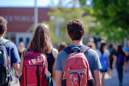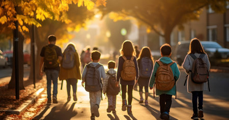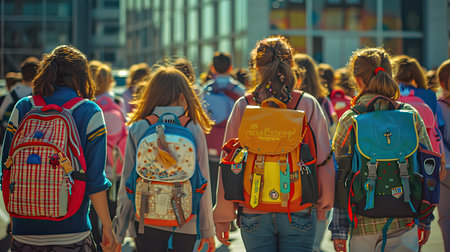 Kids and teens with backpacks walking across a school courtyard in soft backlight, back-to-school concept for education, youth lifestyle and community messaging.