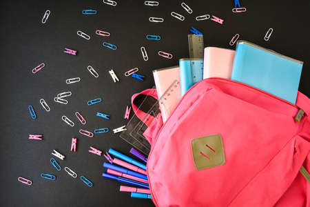 Pink Backpack With School Supplies on a Blackboard Background, Back to school, ruler pen books paper clips clothespin