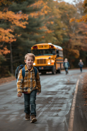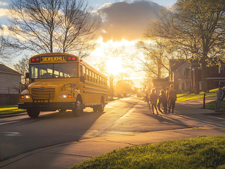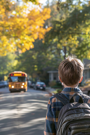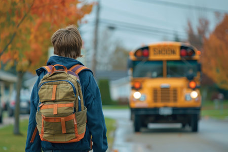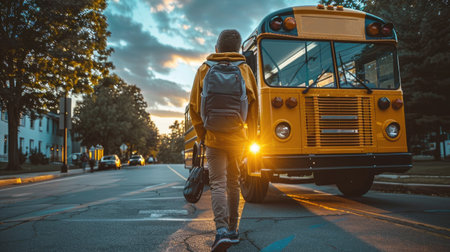 Young Student Walking Towards School Bus at Sunrise with Backpack on a Quiet Street