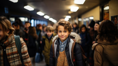 Portrait of a cute little boy in school corridor looking at camera. Generative AI.