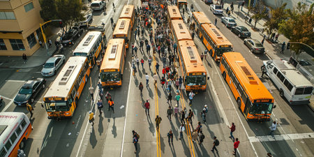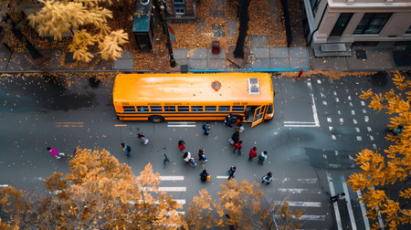 Aerial view of School bus and children in the town street in autumn. Back to school concept.