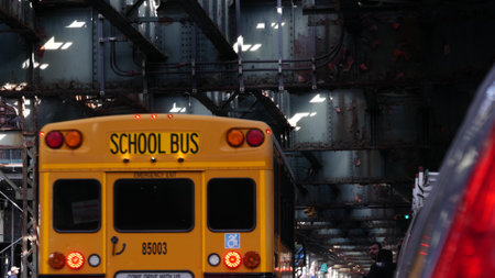 New York City, United States - 7 Sept 2023: Elevated subway above street. Metropolitan bridge over road, Queens. Overhead metro line. Car under railway track. Urban life. Yellow school bus, education