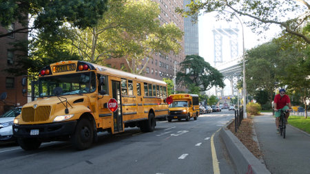 New York City, United States - 7 Sept 2023: Yellow School Bus, Manhattan bridge, schoolbus truck, city street. Children education and USA transportation. American residential district school shuttle.