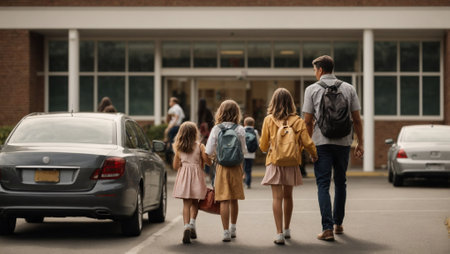 Parents dropping off their kids at school, portraying a moment of separation and independence. Education and child growth concept. Copy space.