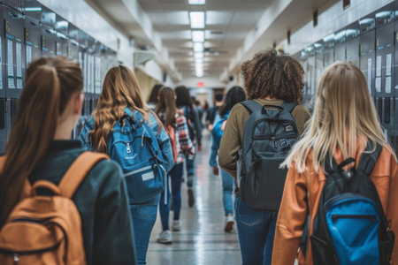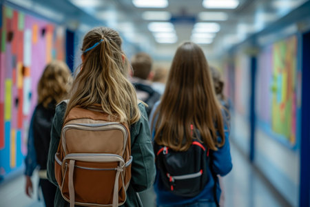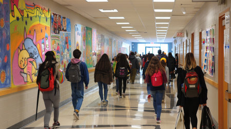 A group of students strolls down a vibrant school corridor, each carrying backpacks and chatting, capturing the essence of youthful energy and learning in a modern educational environment.
