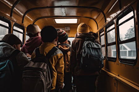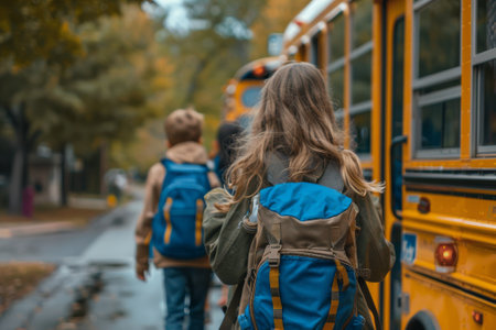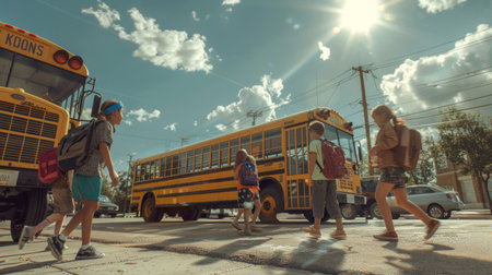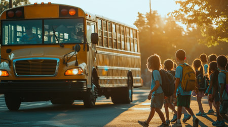 Children boarding a school bus on a sunny day, ready for their school adventure