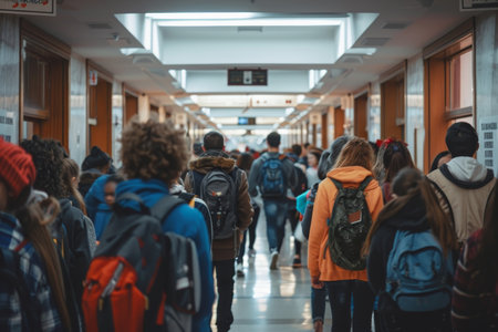A crowd of students walking down a bustling hallway in a school or university, A bustling hallway filled with students on their way to class