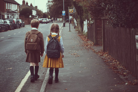 Two siblings in school uniforms walking down a suburban street on a cool autumn morning towards their school