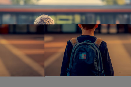 A child with a backpack stands in front of a school entrance, ready for a new day.