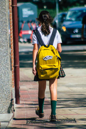 Seville Spain September 22, 2021 School girl walking in the street during the coronavirus outbreak hitting Spain, wearing a mask is not mandatory but most people wear it