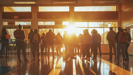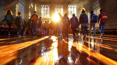 A group of students walks together in a school hallway at sunset, casting warm light and dramatic shadows on the polished floor, symbolizing growth and camaraderie.