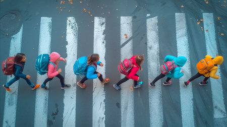 A group of students with backpacks walking on a pedestrian crossing