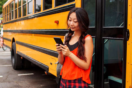 Asian Teen Girl Standing By A Big Yellow School Bus Door With Her Backpack.