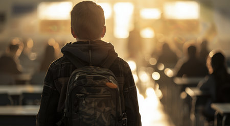 A student with a backpack walks away from a classroom. The sun shines brightly through a window in the background, casting a warm glow on the scene.