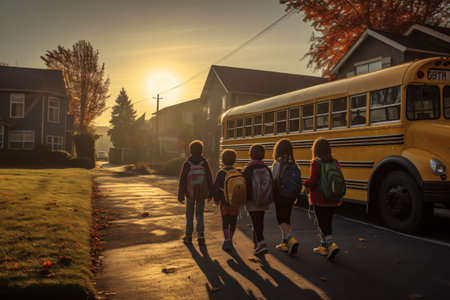 Children walking towards a yellow school bus in the morning sunlight.