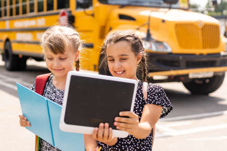 Cheerful teen classmates chatting at classic school bus. Three school children standing at yellow academic shuttle waiting boarding. Cheerful teenagers friends communicating outdoors before studies.