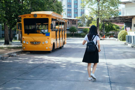 Black long hair college girl in uniform heading to the yellow bus, the university service for the student.