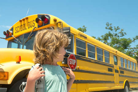 Young student with a backpack walking towards the school bus, viewed from behind