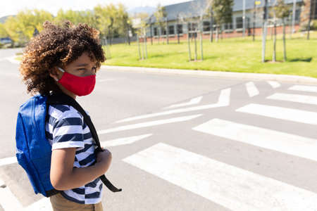 Schoolgirl wearing face mask, crossing the street. Education back to school health safety during Covid19 Coronavirus pandemic.