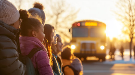 Excited and eager children joyfully wait for their school bus underneath a stunning winter sunrise, capturing a moment filled with anticipation and pure joy