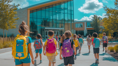 A group of children with colorful backpacks walk toward a modern school building, representing the return to school and new beginnings