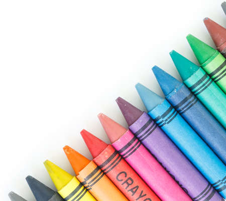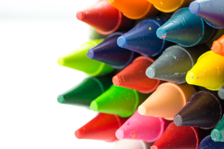 Composition of colorful crayons on white surface with copy space. School equipment, drawing tools and creativity concept.