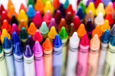 Crayons of different colors pointing upwards on white wood. Education concept. Art concept.