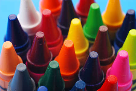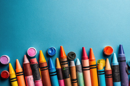Variety of colorful crayons of different shades and colors are arranged in an array, along with their associated colored caps, on a smooth, vibrant light blue backdrop.