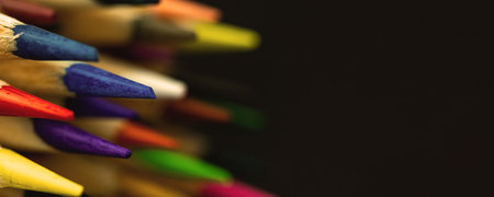 Sharp tips of the colorful pencils, banner photo with black background and copy space, close up